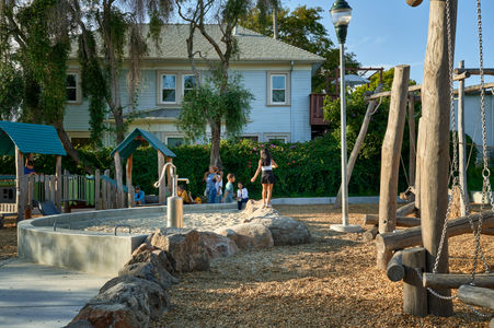 The two existing children’s play areas are completely renovated and include a diversity of rustic nature play equipment for both younger and older children. In response to the community’s wish for a consolidated area, the older children’s area is relocated adjacent to the younger children at the west side of the park. During the concept phase, we heard from the community about their desire for an open activity area, so where the park joins the city, a welcoming corner entry that expands into a small plaza is included.